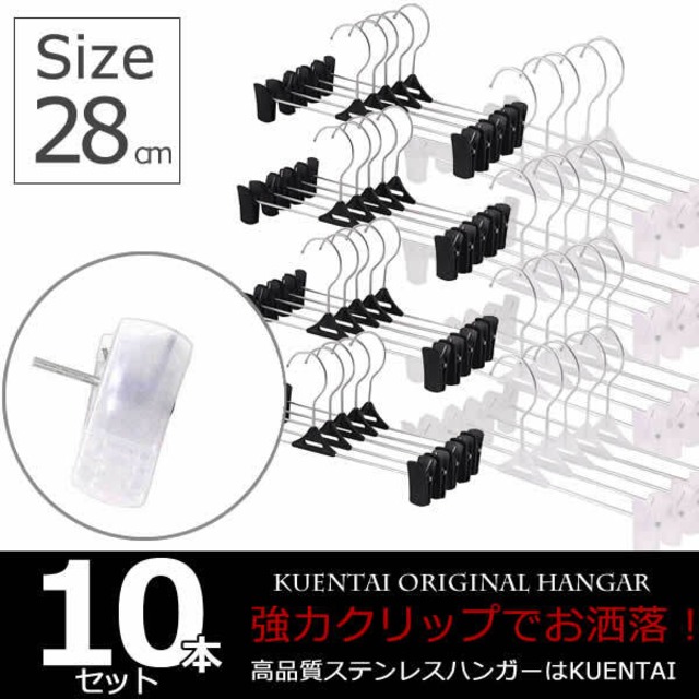 【ポイント】 通常よりキツめにクリップを製作しているので、重たい洗濯物やボトムスでも落ちずにしっかり挟んでくれます。 洗濯ものはもちろん、タンスにしまっているズボンやスカートなど様々な物に使用できます! クリップ部分はプラスチックタイプなので軽量で幅を変えれるので掛けるのものによってサイズ調整してお使いいただけます。 10本セットなので、一人暮らしの方にはおススメのお試しセットです♪ 【セット内容】 プラスチッククリップハンガー10本セット 【カラー】 ブラック・ホワイト 【サイズ】 ブラック:幅28cm/高さ約9cm ホワイト:幅24cm/高さ約9cm 【素材】 ステンレス・プラスチック