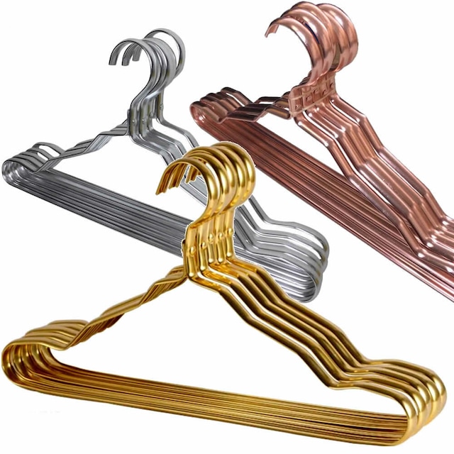 【ポイント】 「軽量でお洒落なハンガーが欲しい!」というお声にお応えして1本約50gと超軽いハンガーが登場!! アルミ素材を使い極限まで軽さを追求しました。 もちろん軽いだけじゃなく、なんと20キロまで耐えれる耐久性も兼ね備えており重たいコートやジャケットも問題ありません! アルミ素材ですので洗濯用として使っても錆びにくく、軽いので洗濯物の移動なども楽ちん♪ 乾いたらそのままクローゼットに運んでも◎ 形状にもこだわり、両肩には凹みがありワンピースやタンクトップ、キャミソールなどもズレ落ちを軽減できるようになっています。 外干しで使っても劣化しにくく、ながく愛用していただけます。 [セット内容] アルミハンガー5本セット [カラー] ゴールド・シルバー・ピンク [サイズ] ワンサイズ:幅42cm/高さ約21cm/重量約50g(1本あたり) [素材] アルミ