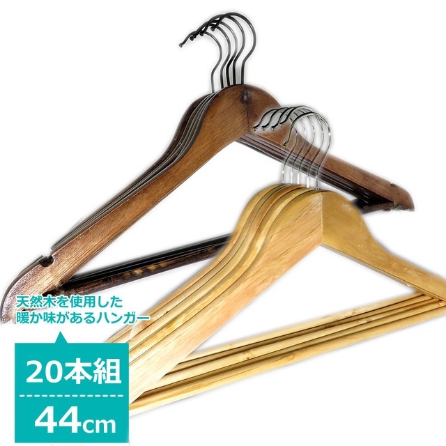 【ポイント】 天然の木を使用したお洒落で愛着のわく木製ハンガーです。 44cmとコートやジャケットなどに最適なサイズで仕上げておりますので、男性女性問わずお使いいただけます。 バー付なので、スーツ上下を掛けていただく事も可能です。 今回は2種類をご用意!暖かみのあるナチュラルと渋さを醸し出すアンティークの2カラーとなっております。 お気に入りの洋服をお洒落なハンガーで収納すると気分も上がりますよ♪ ※製造時期によりフック部分の色が「ブラック」または「シルバー」になる場合がございます。 【セット内容】 天然木製ハンガー バー付 20本セット 【カラー】 ナチュラル・アンティーク 【サイズ】 ワンサイズ:幅44cm/高さ約22.5cm/厚さ1.0cm 【素材】 天然木