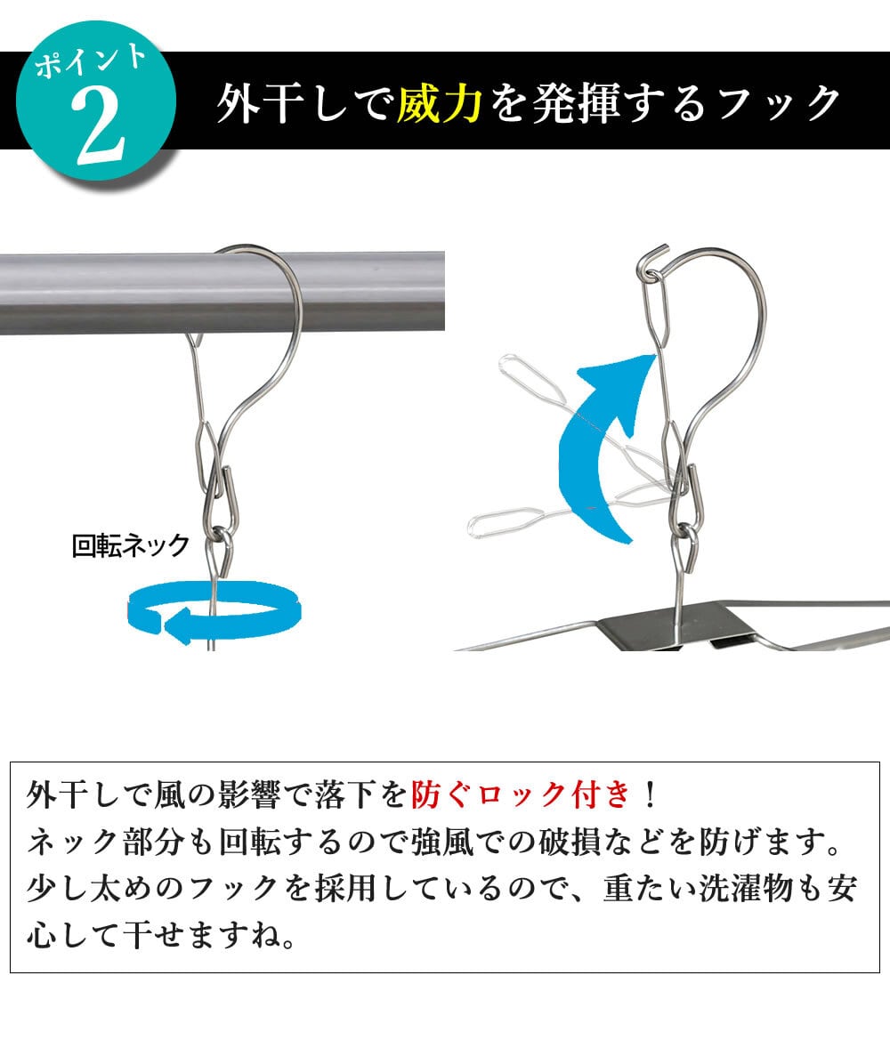 フック部分にはキャッチフックが付いているため、風が強い日の外干しも問題なし。
