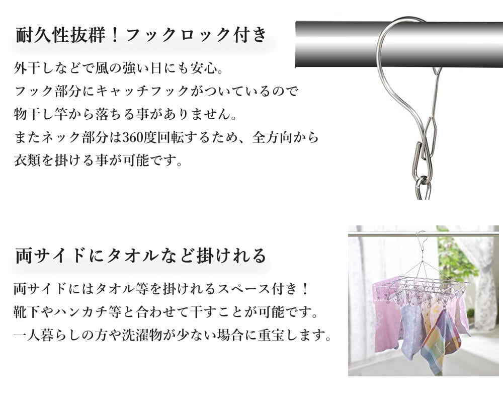 フック部分にはキャッチフックが付いているため、風が強い日の外干しも問題なし。