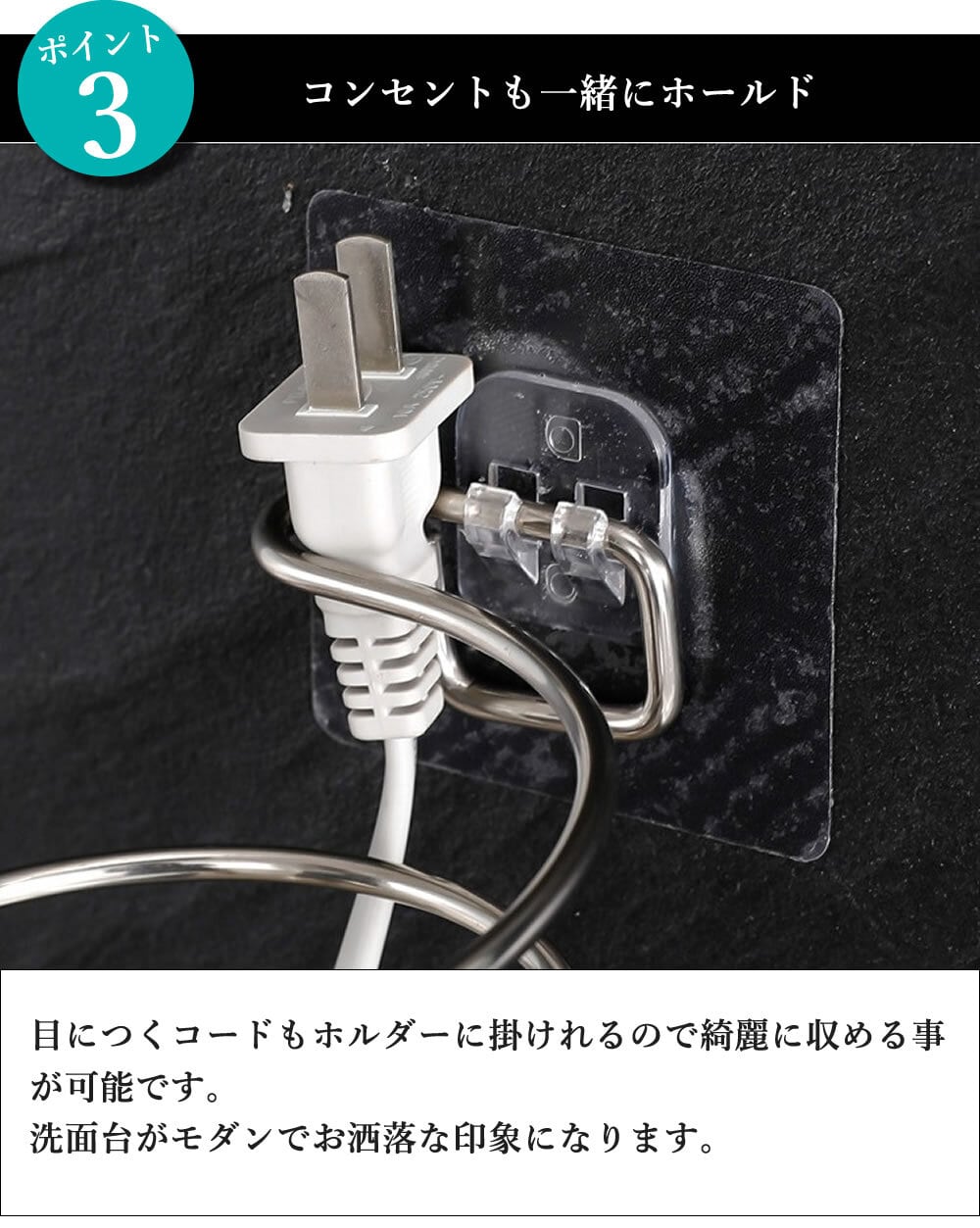 耐荷重量1.5キロまで可能ですので、重たいドライヤーも問題なく収納できます。
