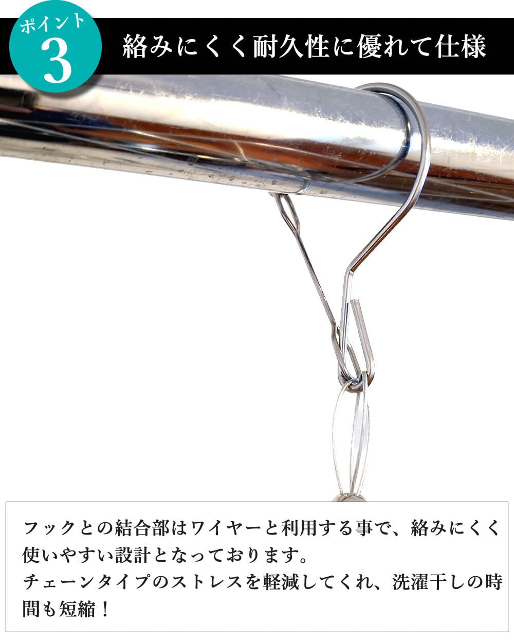 フレームとフック部分はワイヤーで接続しており、絡みにくくとても使いやすい!