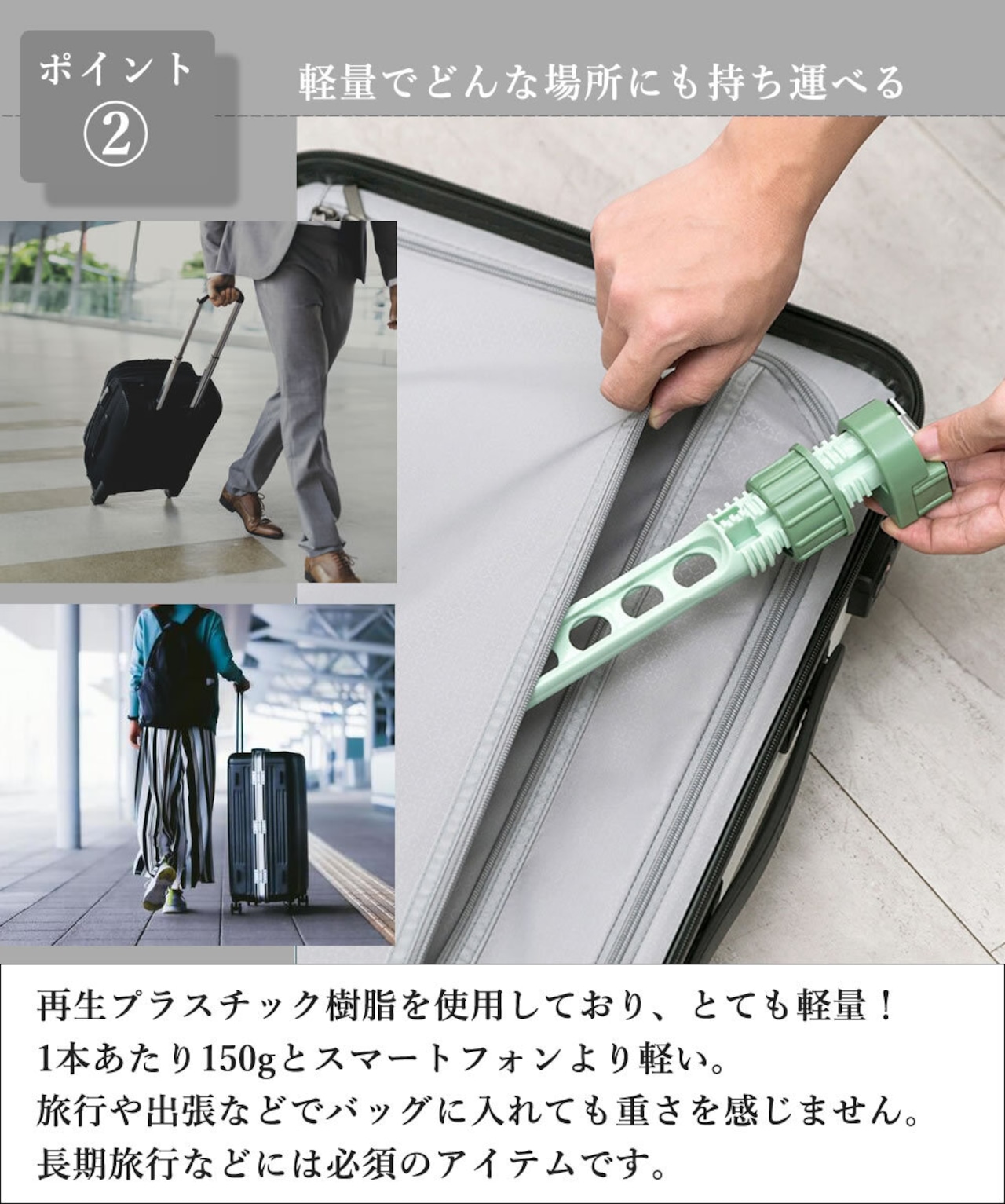 1本あたり150グラムとスマホより軽いので、長期の旅行や出張などに持っていくと、とても重宝します。