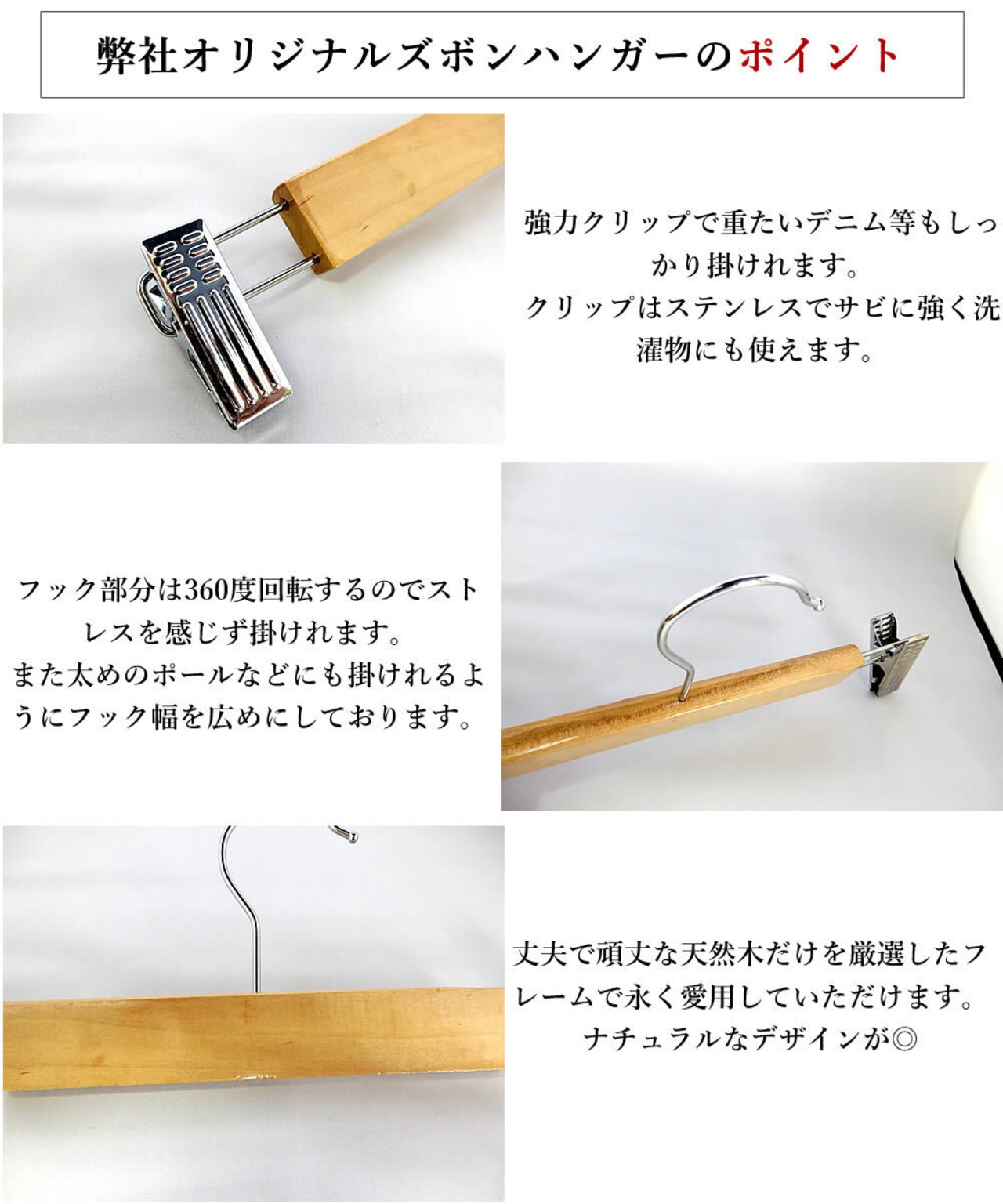 天然の木を一つ一つ丁寧に組み合わせた木製+ステンレス素材のパンツハンガーです。
