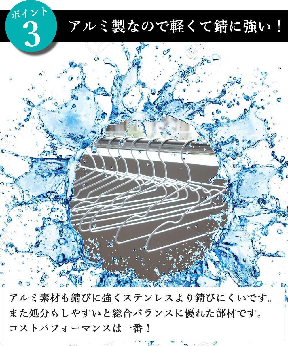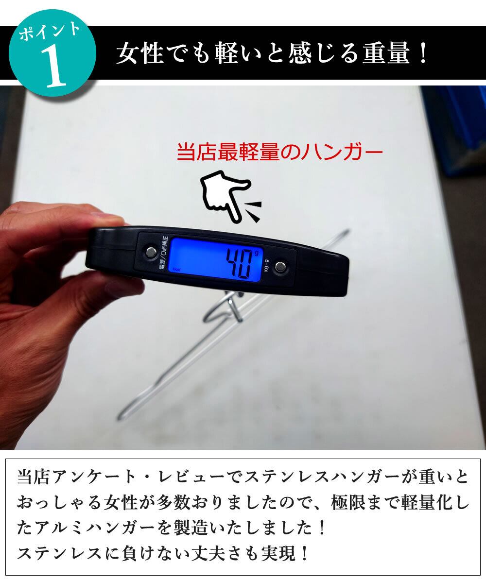 前回ステンレスハンガーをご注文いただきましたお客様へアンケートを行った結果「少し重い」「ポールハンガーが重さに耐えれるか心配」「子供のお手伝いでは使いづらい」とのご意見をいただきましたので、今回ステンレスハンガーより約30%軽いアルミを使用して新作ハンガーを製造いたしました。