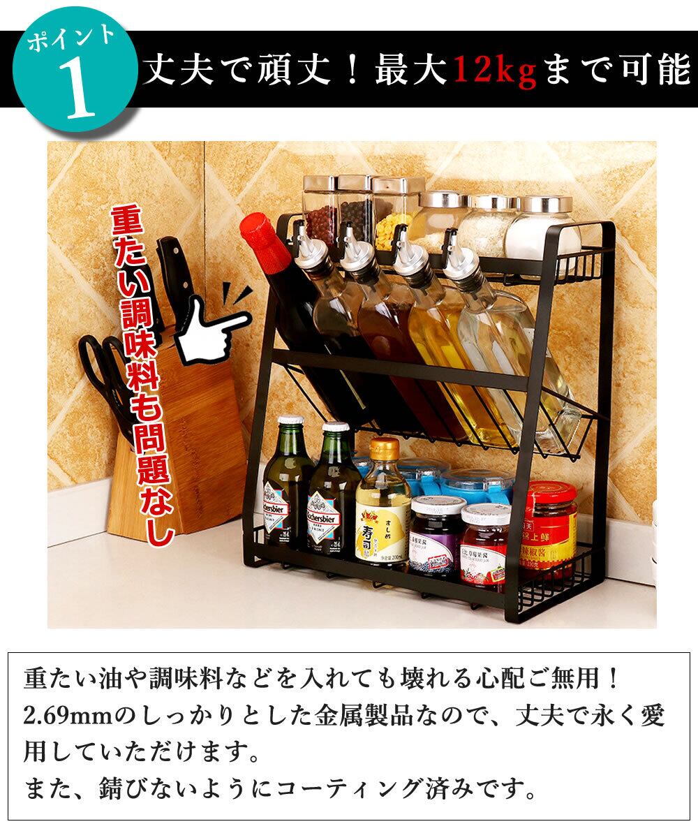 重厚感ある安定したラックなので、重たい調味料やボトル、油などもしっかりと収納できます。