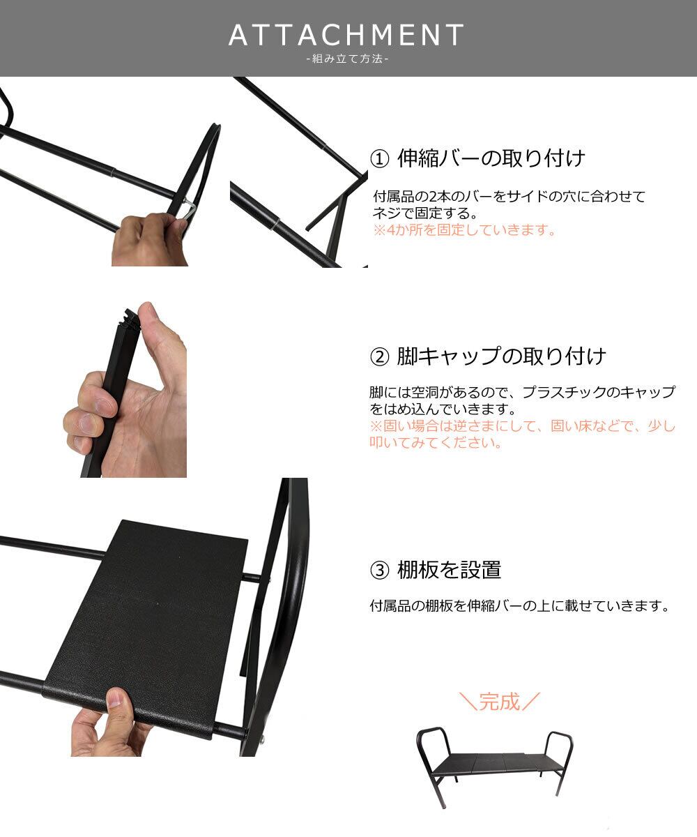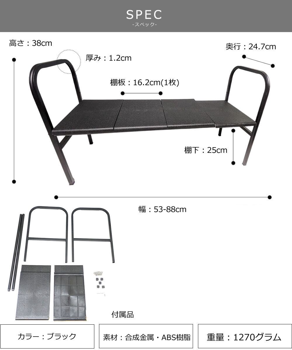 幅:約55cm-88cm / 高さ:約38cm / 棚下:約25cm / 奥行:約24.7cm / 厚み:約1.2cm / 重さ:約1270g / 耐荷重量:約10kg / 棚板:約16.2cm(1枚当たり)